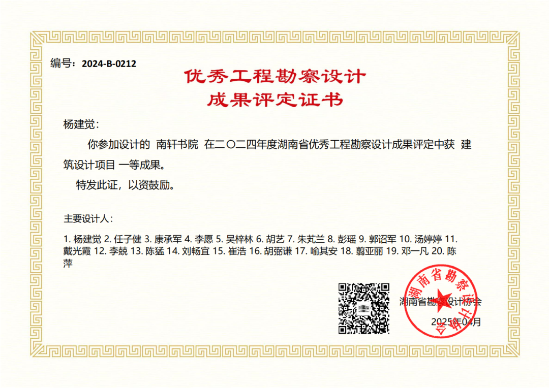 青羊湖畔,官山腳下,讓人眼睛一亮的【寧鄉巷子口南軒書院】,承湖湘文脈、融山水毓秀,古韻今風,相映成趣,這項由公司設計總監楊建覺先生主持的設計作品,近期斬獲2024年度湖南省優秀工程勘察設計一等獎。
