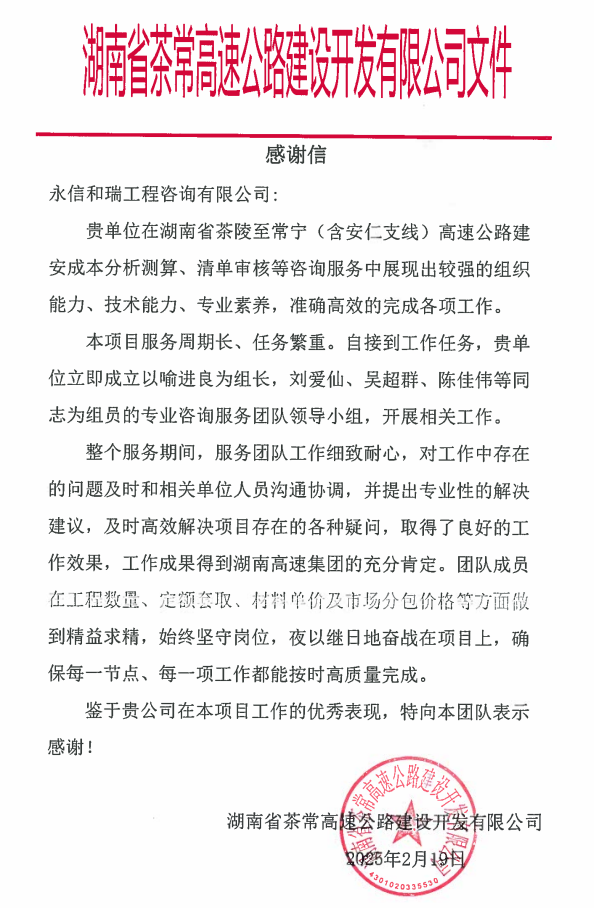 接到相關任務后,我司造價事業部積極響應,迅速成立以喻進良為組長,劉愛仙、吳超群、陳佳偉為組員的咨詢服務團隊,開展各專業施工圖預算審核、清單審核、成本測算等工作,憑借嚴謹態度、過硬技能與緊密協作圓滿完成任務,獲得了來自茶常高速公路建設開發有限公司的高度認可與誠摯感謝。諸位同事在工程數量、定額套取、材料單價及市場分包價格的測算確定過程中堅守崗位、精益求精,細致準確地協助項目建設單位在嚴控投資額、嚴把質量關前提下高效推動進度、成功縮短工期,為茶常高速順利實現年底通車奠定堅實基礎。